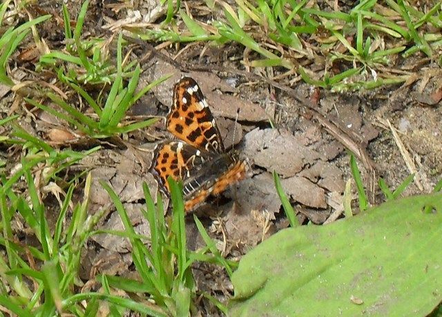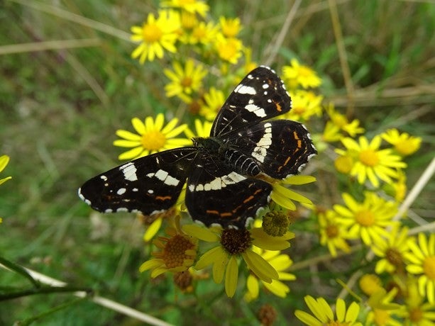 Foto onder: Het landkaartje van de voorjaarsgeneratie is de bovenkant van de vleugels oranjebruin met een zwart vlekkenpatroon.