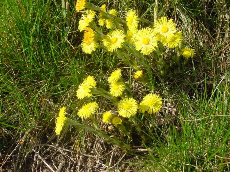 Foto onder: Klein hoefblad is een naakt bloeier, de plant bloeit eerst met goudgele bloemen.